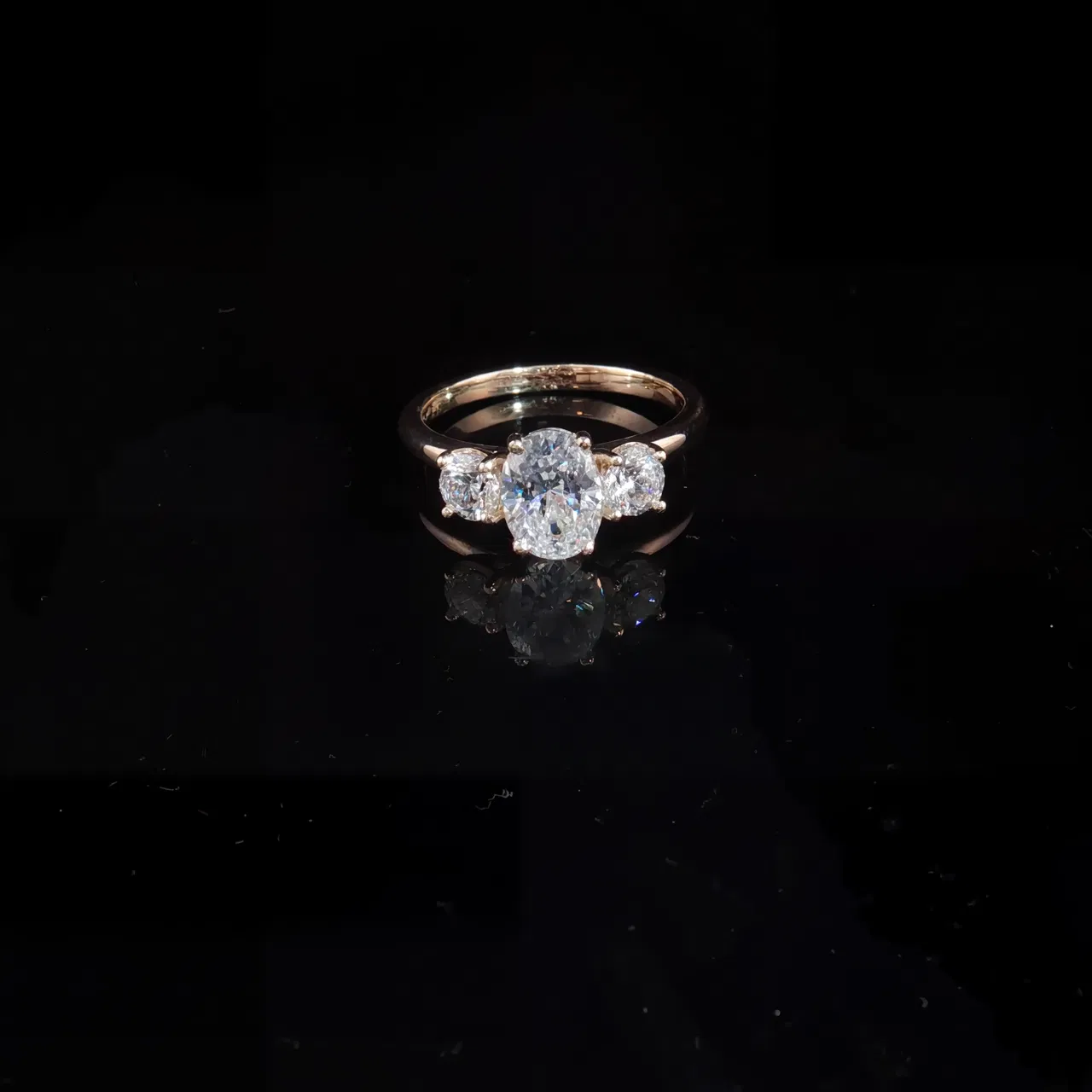 En elegant och tidlös trestensring där en strålande ovalslipad diamant står i centrum. Den mjuka, avlånga formen ger ett sofistikerat uttryck och skapar en smickrande silhuett på handen. På vardera sida om mittstenen sitter två briljantslipade runda diamanter som förstärker ljusspelet och ger ringen en vacker balans.
