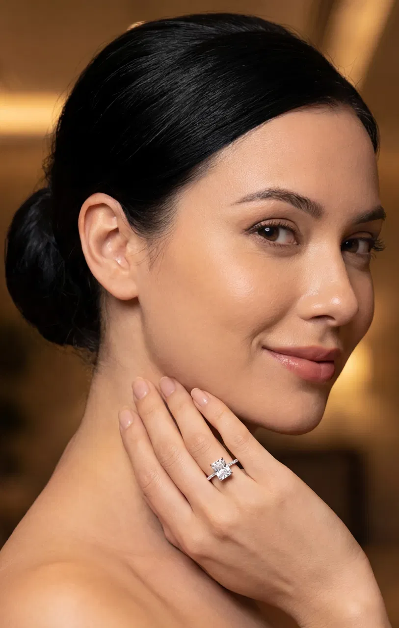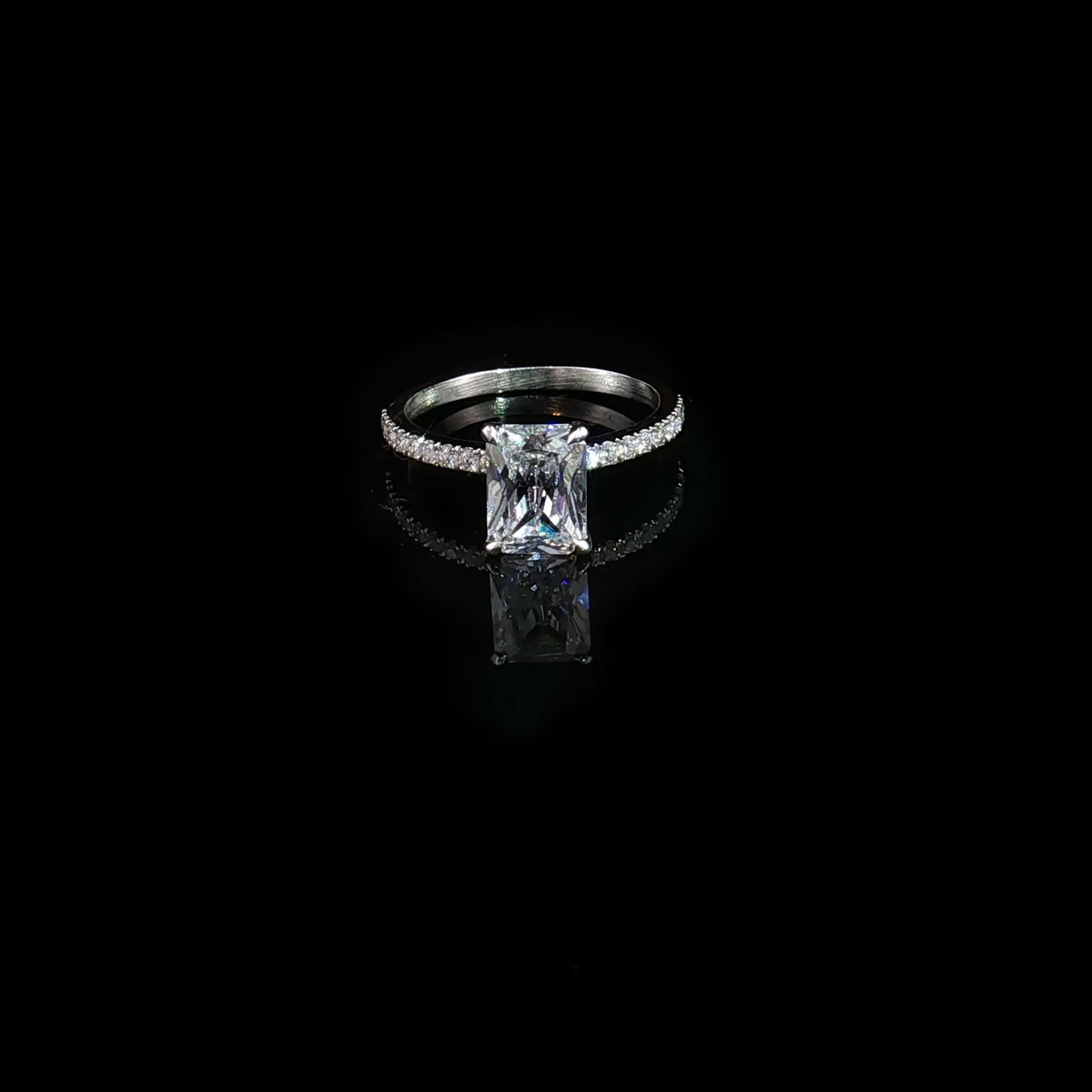 Tillverkad i glänsande vitguld över silver har denna flerstensring en elegant smaragdslipad diamant, känd för sina rena linjer och sofistikerade trappslipning. Ett tidlöst smycke, perfekt för att tillföra en touch av diskret glamour till varje outfit.