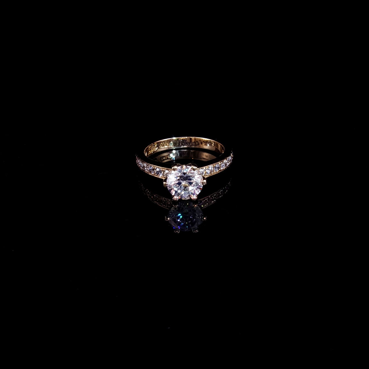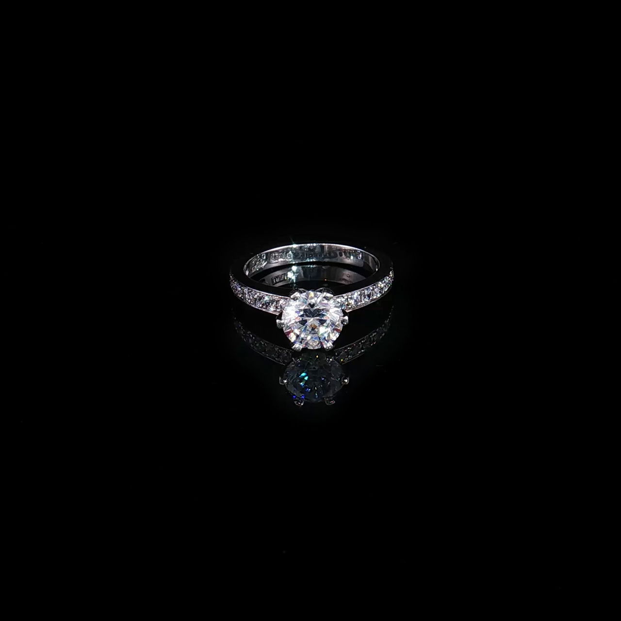 Denna exklusiva solitärring förenar klassisk design med modern lyster. I centrum sitter en briljantslipad rund diamant som fångar och reflekterar ljuset från varje vinkel. Den gnistrande mittstenen ramas in av en smal, pavéinfattad skena där små diamanter löper längs sidan och förstärker helhetens briljans utan att ta fokus från huvudstenen.