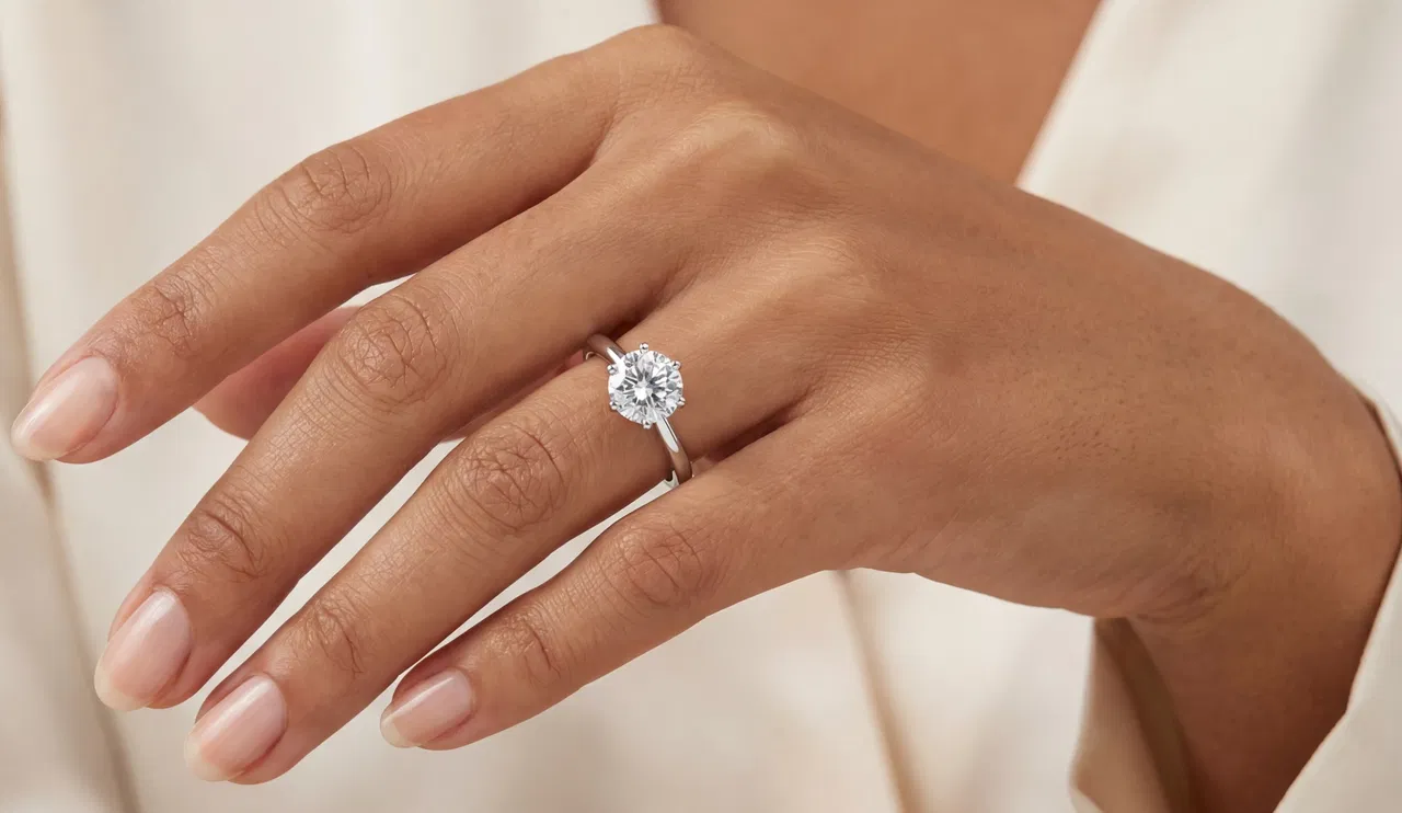 Med en fängslande rund briljantslipad diamant i centrum. Ringens tidlösa design framhäver diamantens exceptionella eld och lyster, vilket gör den till en oförglömlig symbol för kärlek och engagemang. Denna sofistikerade ring tillför en utsökt touch av elegans till varje outfit.