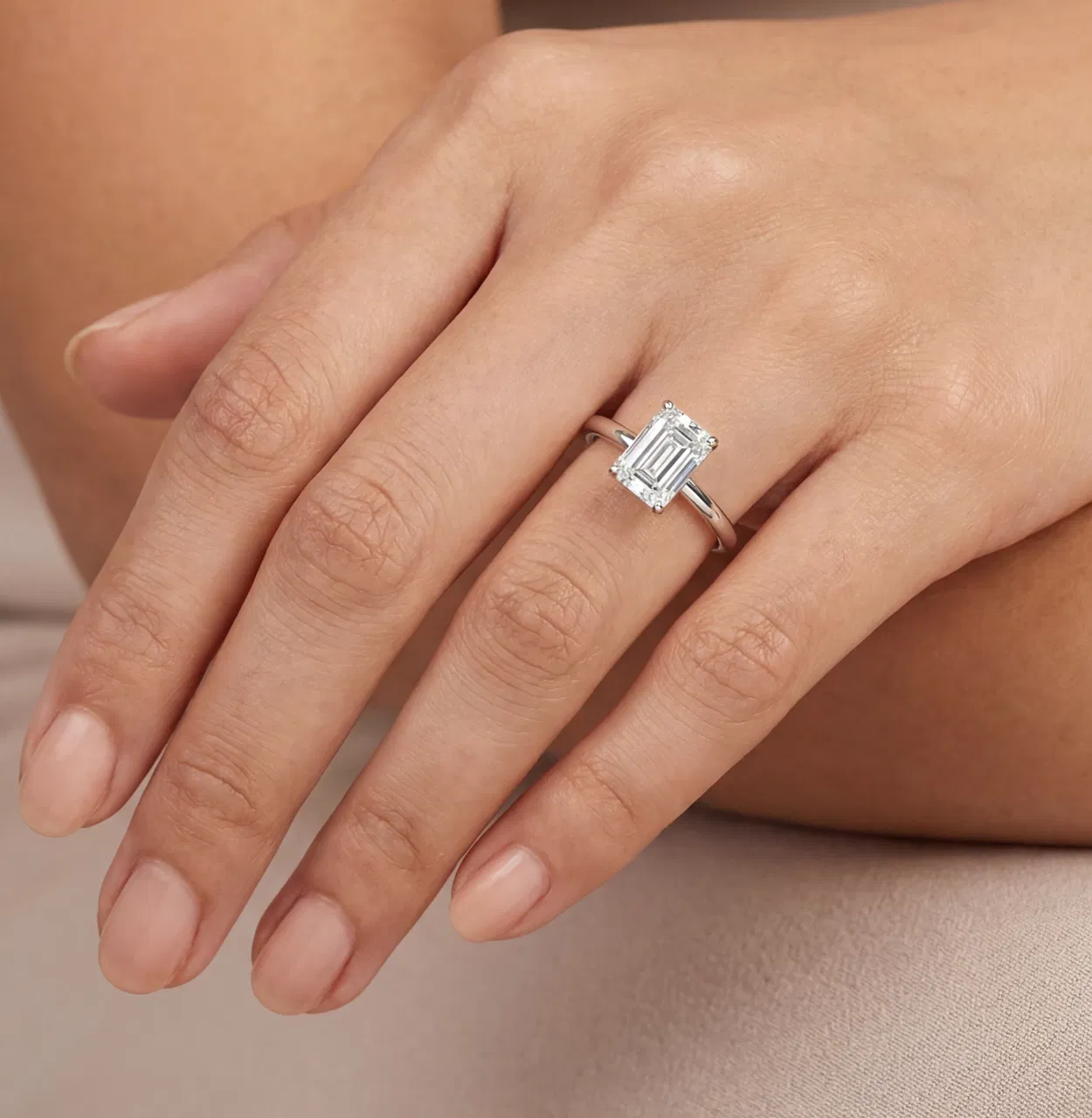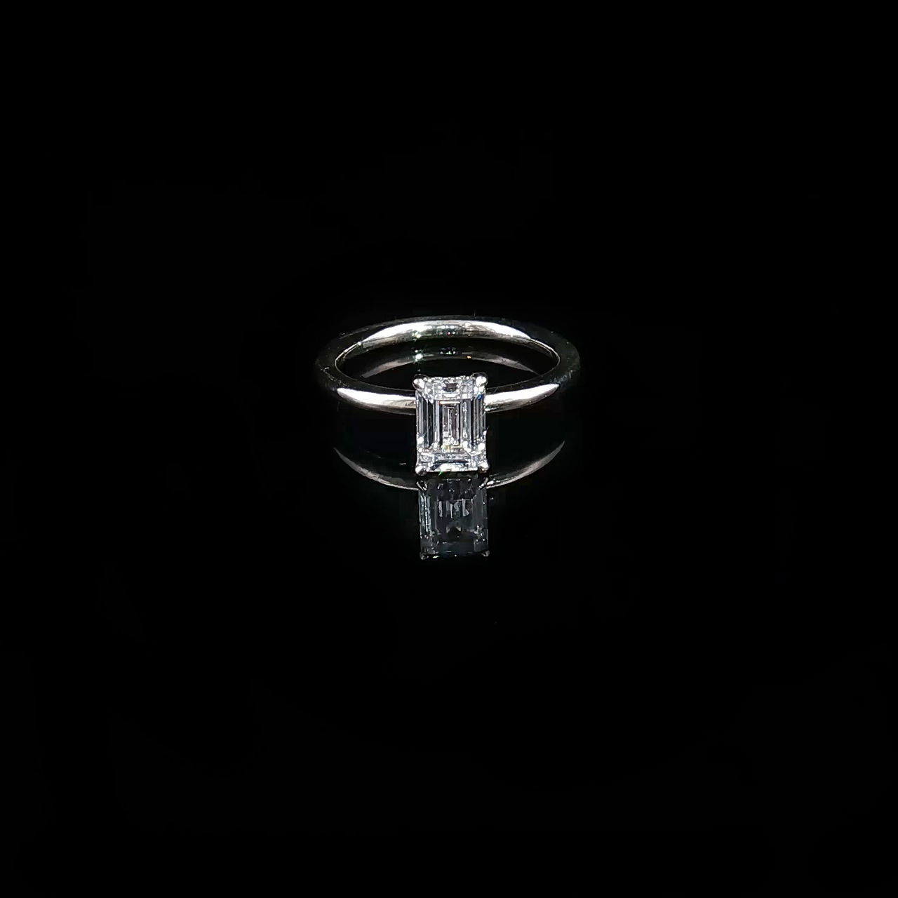 Utsökt solitärring med en fantastisk smaragdslipad diamant, uppskattad för sin tidlösa elegans och geometriska karaktär. Diamantens trappslipade fasetter framhäver en enastående klarhet och är infattad i en stilren bas av vitguld som förstärker stenens lyster. En fängslande symbol för modern sofistikation.