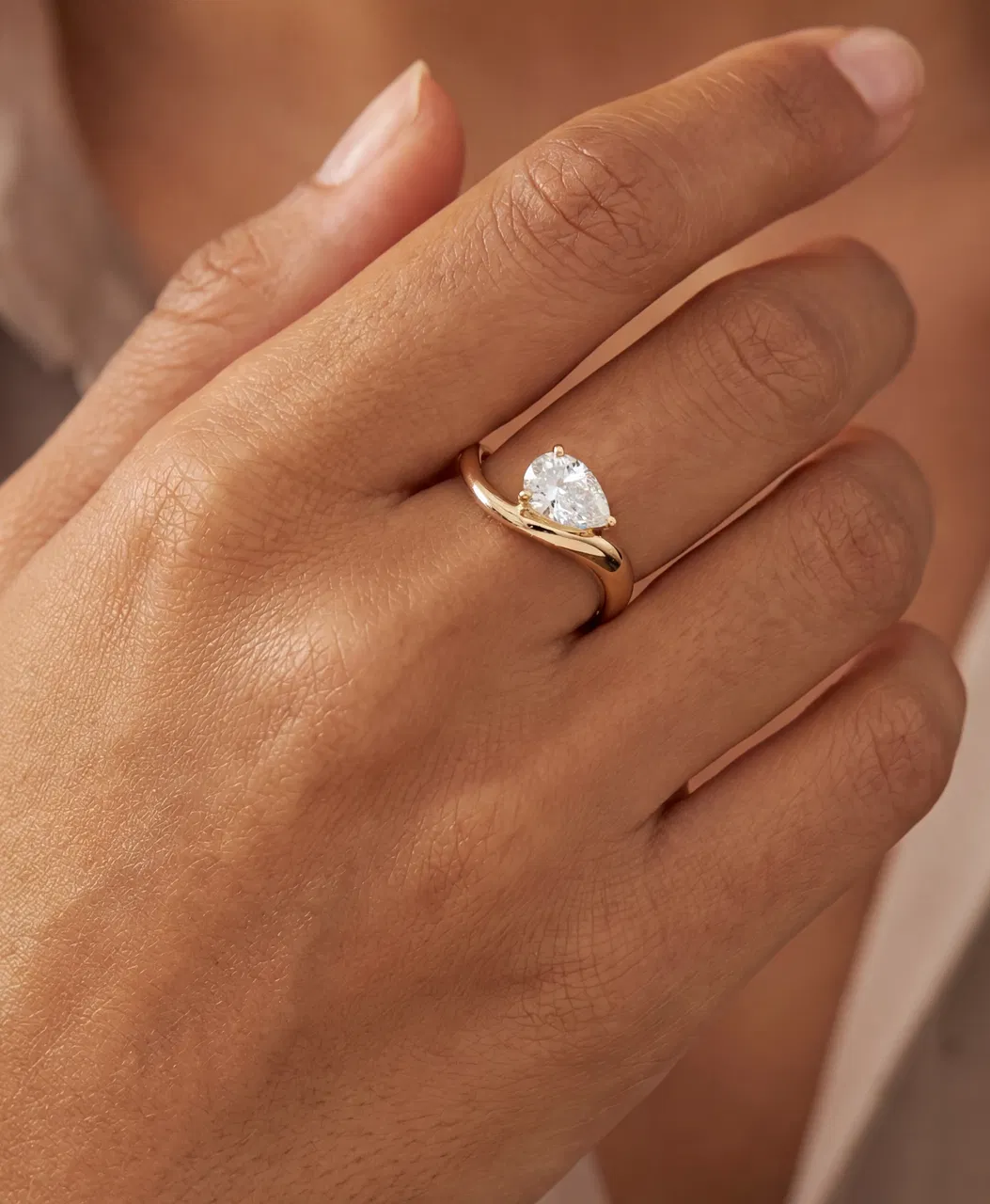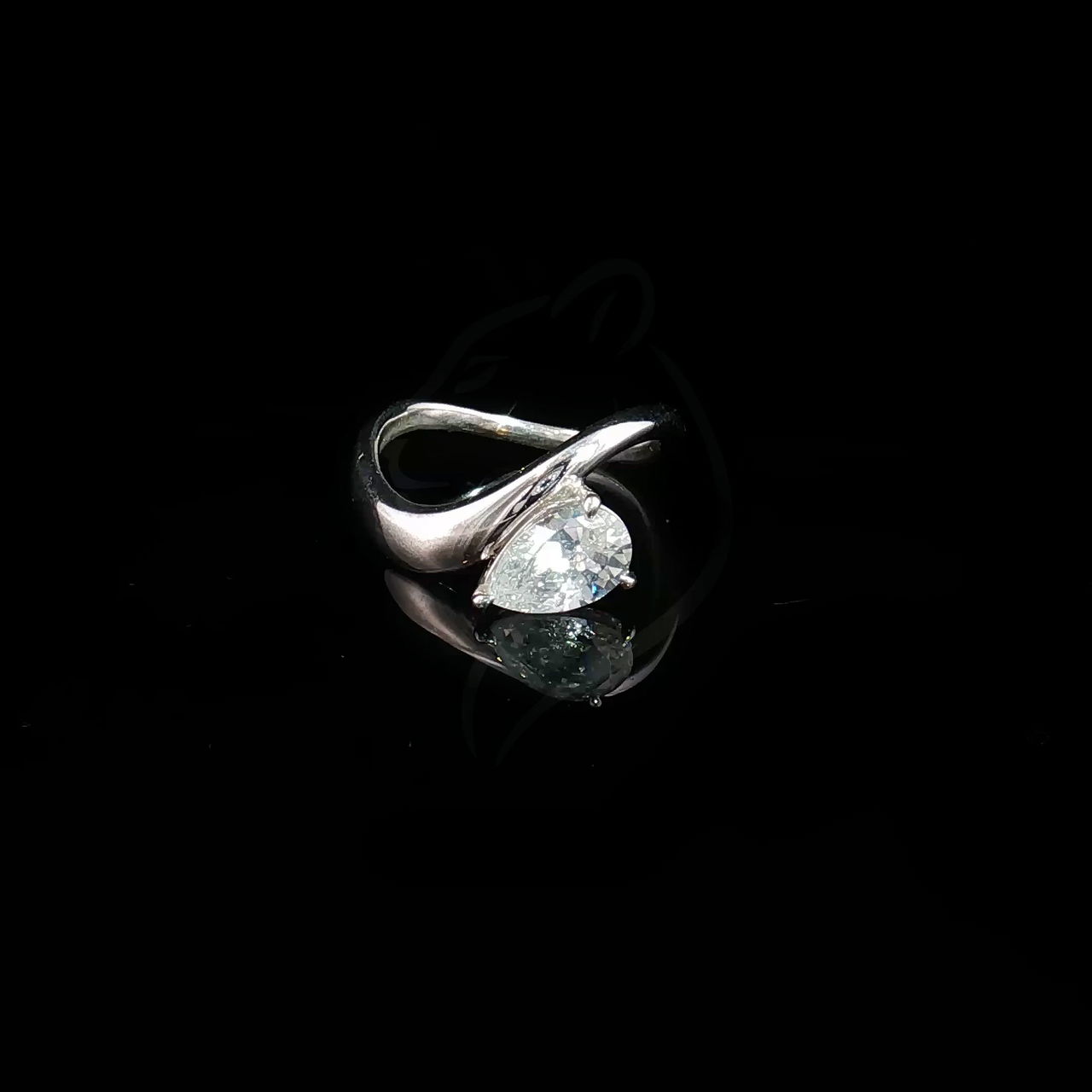 Utsökt solitärring med en päronformad diamant, noggrant slipad i briljantslipning för att maximera dess eld och lyster. Skens design i polerat vitguld framhäver diamantens strålglans. En tidlös och elegant formgivning, perfekt för att fira livets speciella ögonblick.