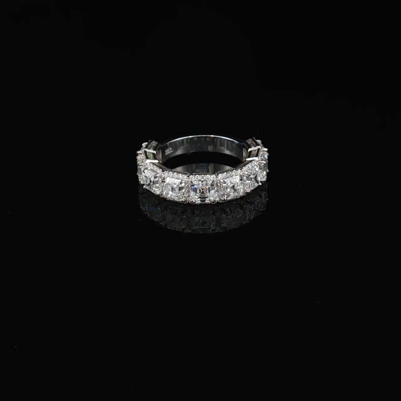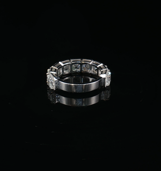 Denna sofistikerade eternitetsring består av en kontinuerlig rad smaragdslipade diamanter, noggrant infattade i en stilren kanal av 18K vitguld. Varje diamant har en exakt stegslipad fasettering som ger en enastående klarhet och en spegelliknande lyster. De parallella, linjära fasetterna i smaragdslipningen framhäver stenarnas höga transparens och jämna färggrad. Ringen är designad för optimal komfort och exklusiv elegans, med en sömlös och symmetrisk utformning som förkroppsligar tidlös lyx och förfinat hantverk.