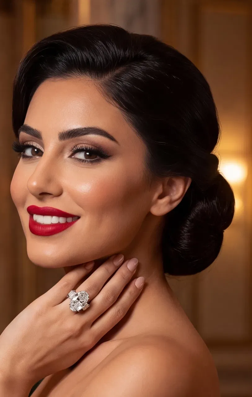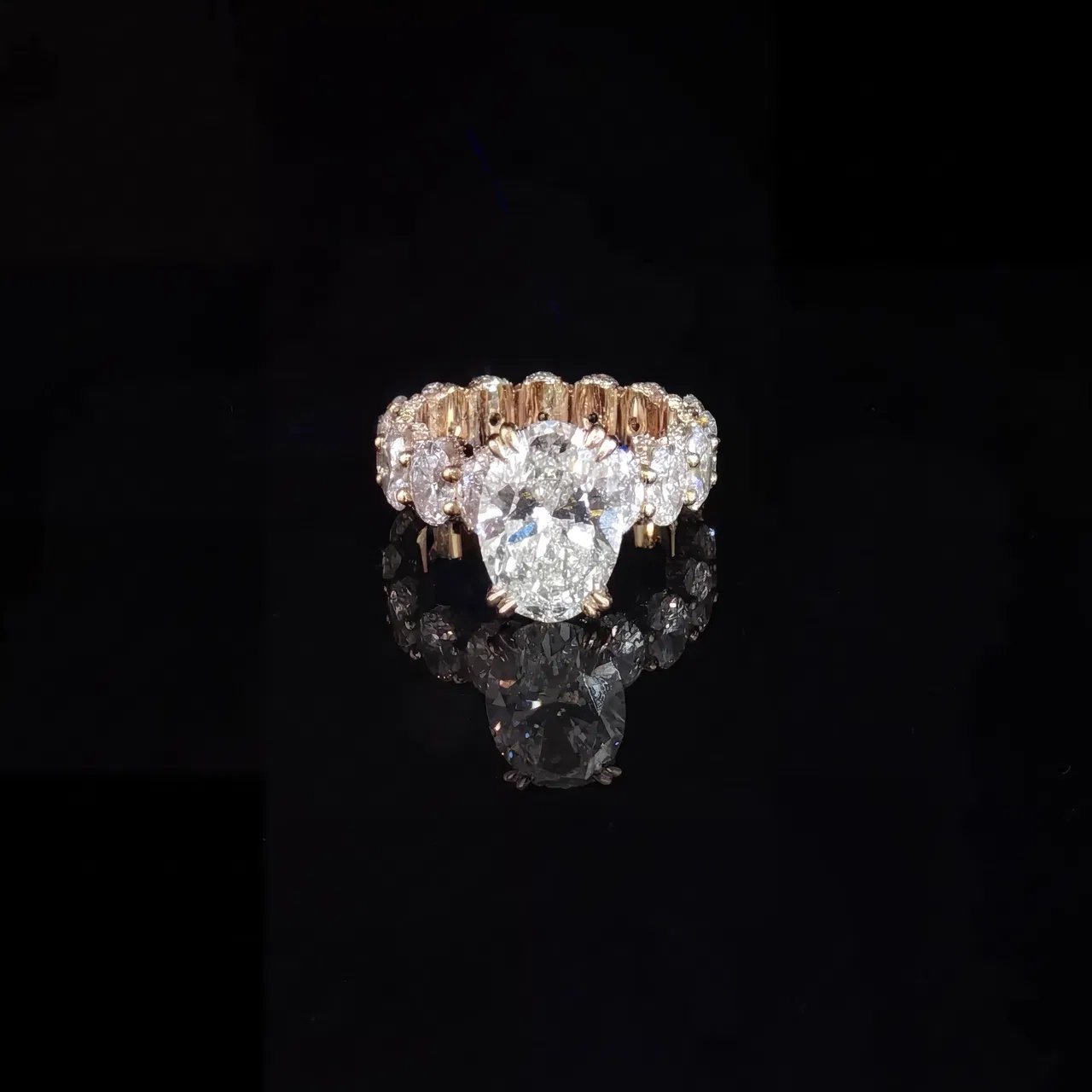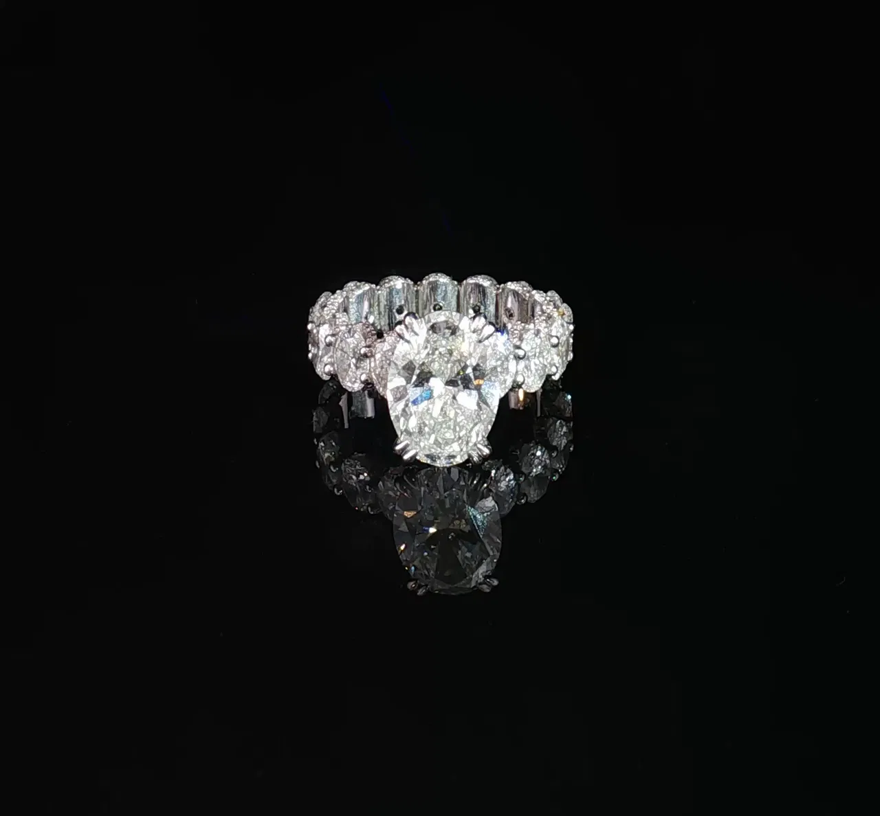 En utsökt förlovningsring i vitguld med en oval briljantslipad diamant som mittsten. Diamanten hålls elegant på plats i en förfinad fyrklofattning som maximerar ljusinsläppet och ger överlägsen lyster och eld. På vardera sida om mittstenen sitter avsmalnande baguetteslipade sidodiamanter längs en högglanspolerad skena, vilket skapar en balanserad och exklusiv helhet. Den klassiska kompositionen framhäver ringens symmetri och klarhet, och ger ett sofistikerat uttryck som lyfter fram den ovala diamantens tidlösa skönhet.
