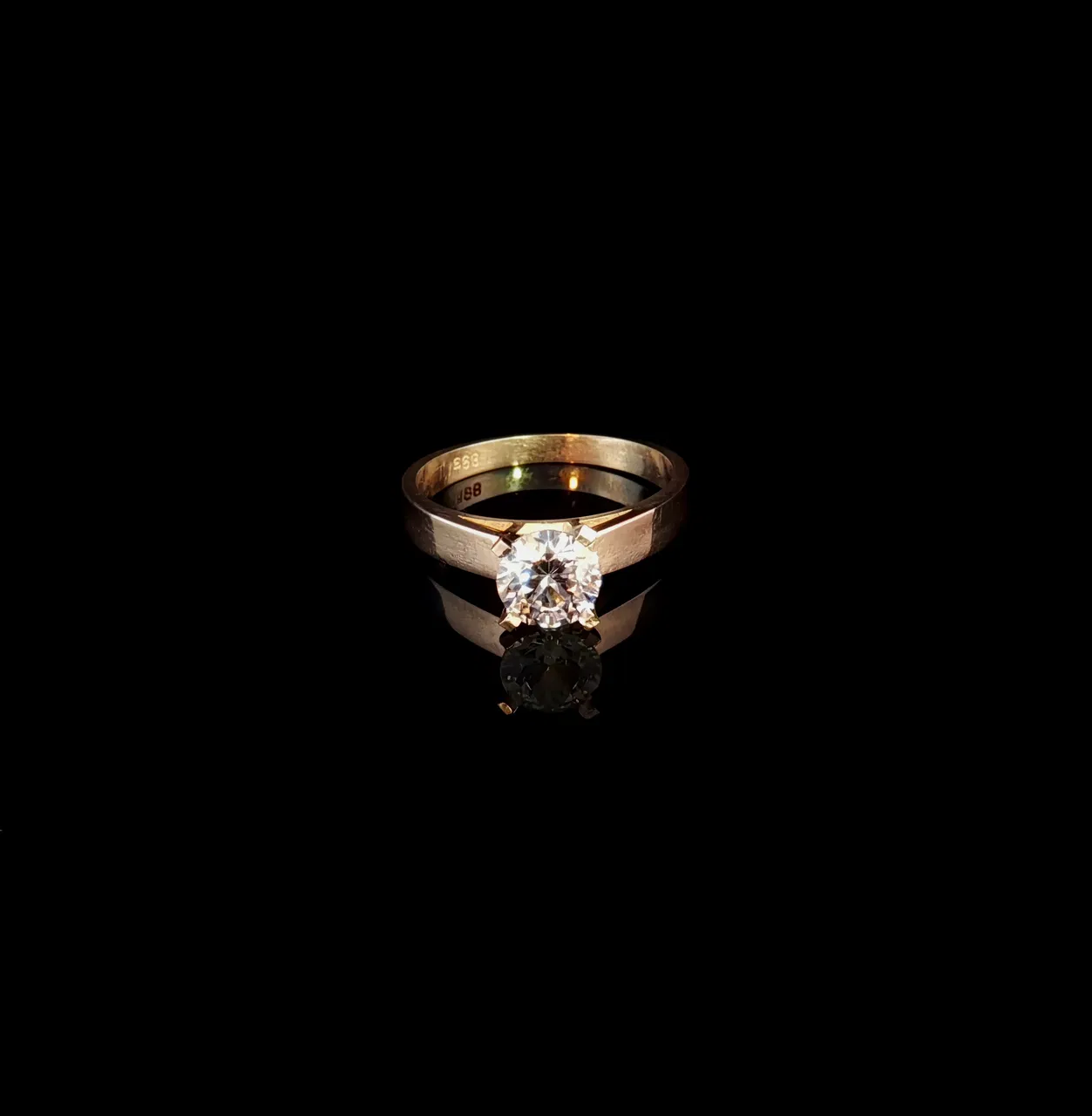 Solitärring som ger uttryck för tidlös elegans och pryds av en magnifik rund briljantslipad diamant. Diamanten är skickligt infattad i ringskenan, där den centrala stenen framhäver en enastående lyster och briljans genom en klassisk kloinfattning. Den släta och minimalistiska ringskenan lyfter fram diamantens symmetri och höga klarhet, vilket skapar en sofistikerad silhuett.