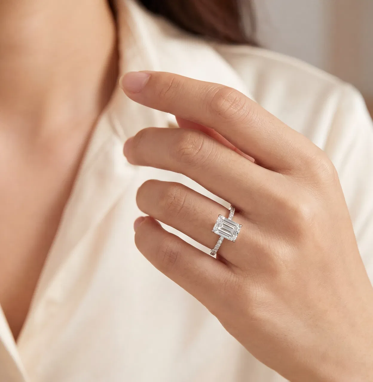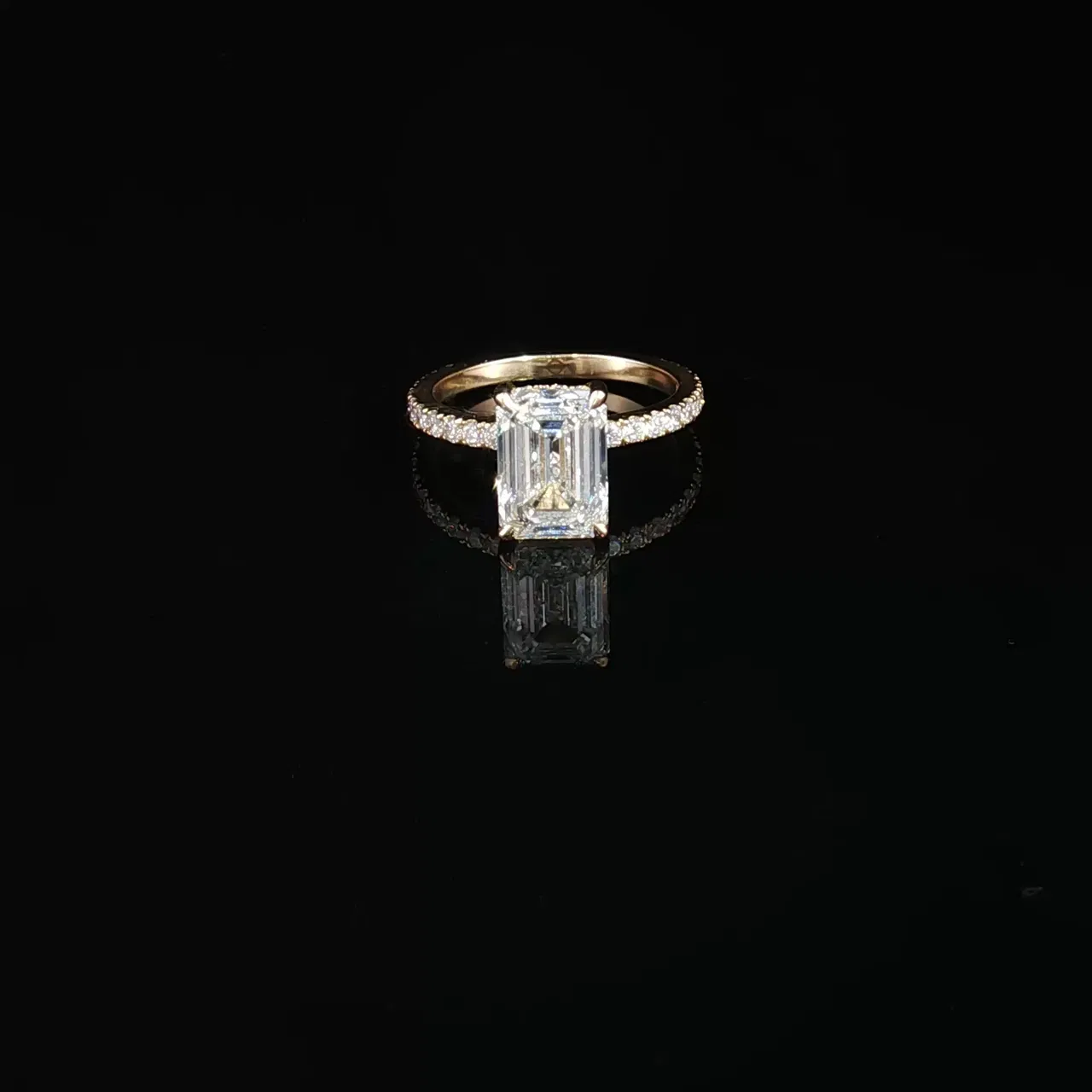 Unna dig den fängslande dragningskraften hos denna multistensring, skickligt tillverkad i glänsande platina och prydd med en stegslepad diamant i smaragdform. Med sin exceptionella klarhet och strålande transparens är diamanten infattad i vitguld för att förstärka dess briljans.