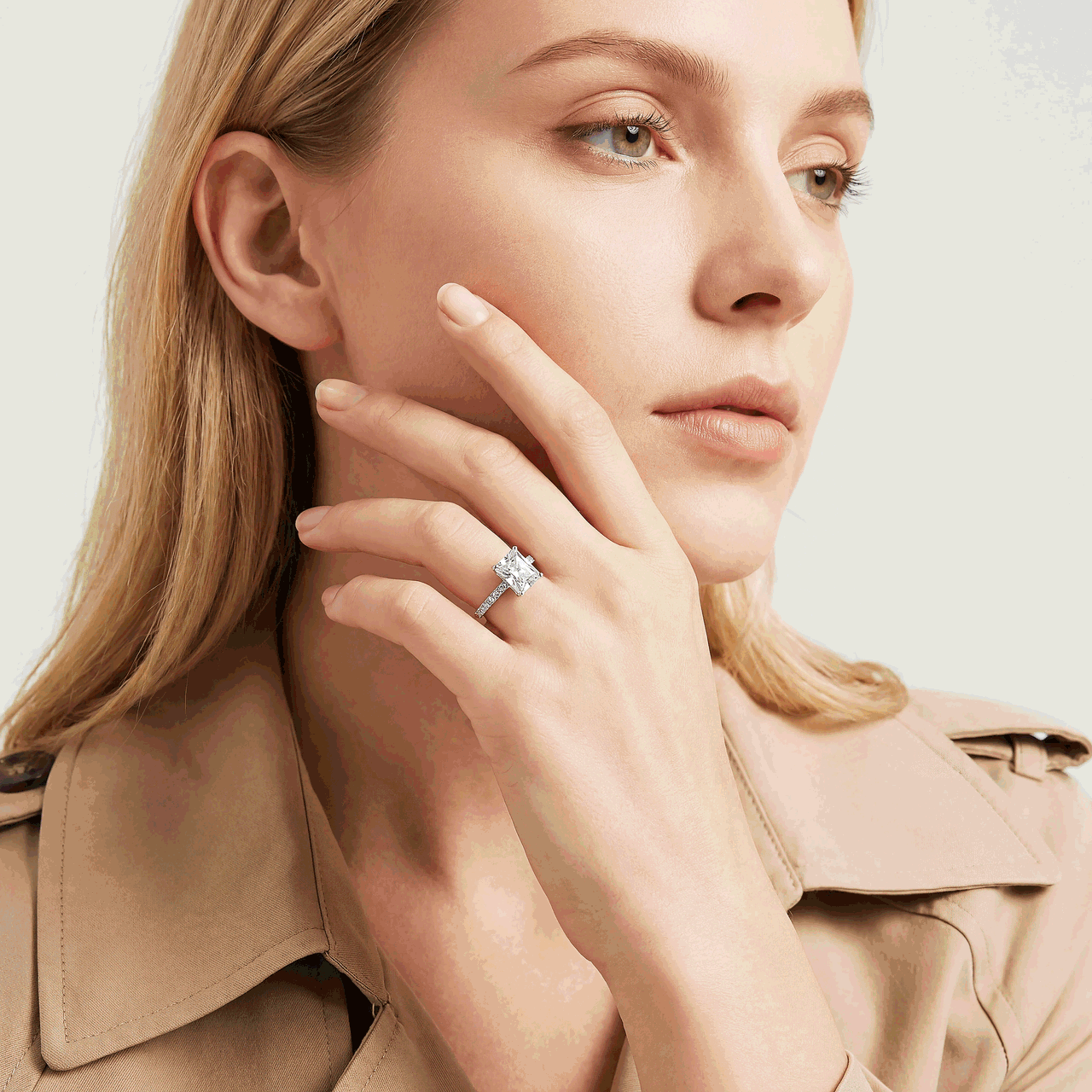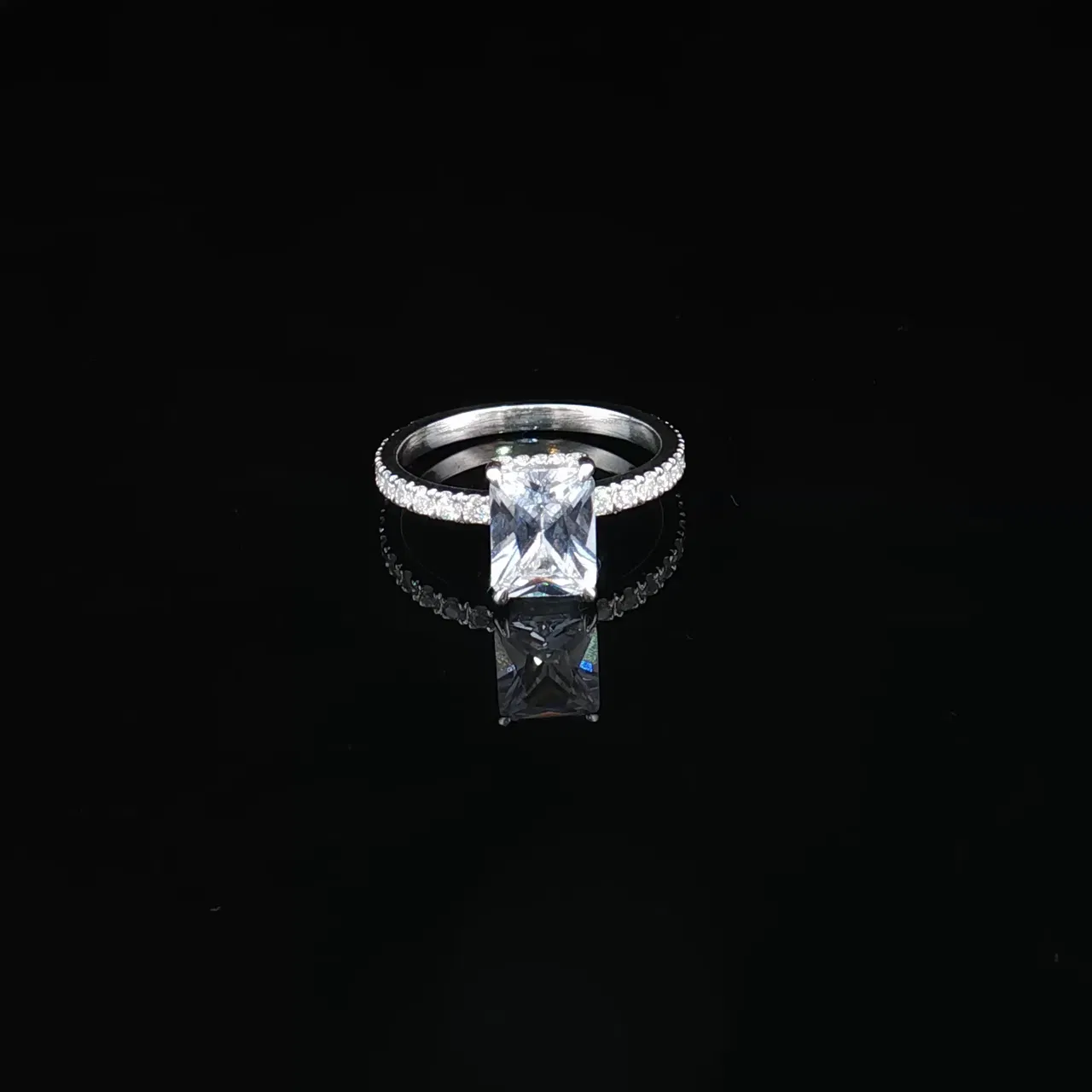 Utsökt multistenring, med en smaragdslipad diamant i briljant slipning. Ringens design framhäver diamantens naturliga skönhet och lyster. Dess komposition och utformning fångar garanterat blicken och tillför en sofistikerad känsla av lyx till varje ensemble.